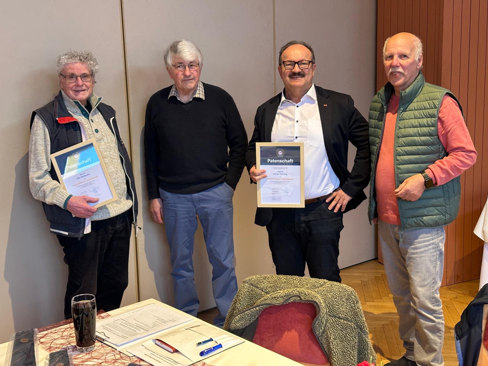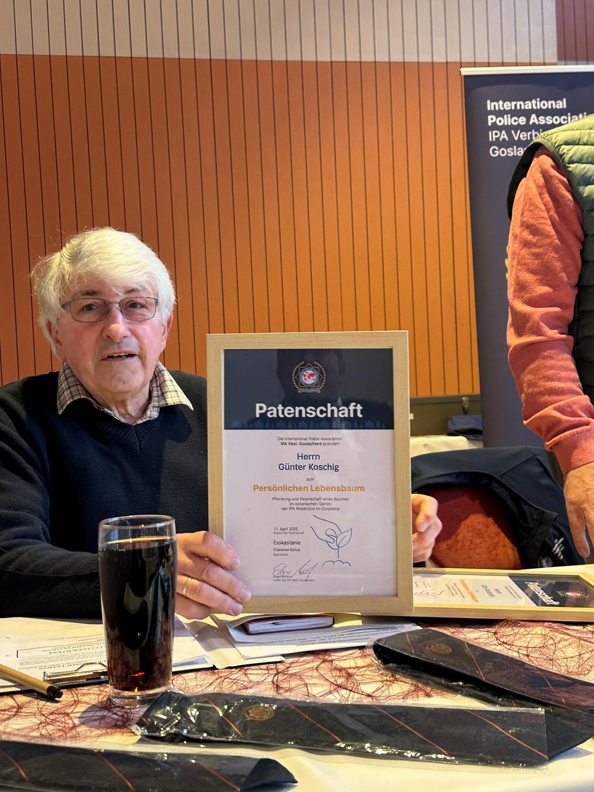 IPA-Kollegen sorgen gemeinsam mit dem Vorstand seit Jahren für Ersatz — durch Pflanzung Ihrer Lebensbäume. So erhielten z. B. Udo Wollentin und Günther Koschig für Ihren Einsatz rund um den “Nachwuchs” des IPA-Waldes ausgesprochenen herzlichen Dank und eine Urkunde, nachdem sie zuvor einen zwei Meter hohen Apfelbaum und eine Esskastanie gekauft, gepflanzt und die Baumpatenschaft übernommen hatten.